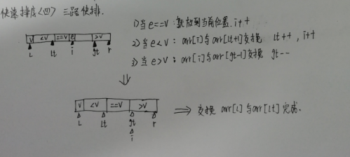 77 cout<<"Test for random array, size = "<<n<<", random range [0,10]"<<endl;78 arr1 = SortTestHelper::generateRandomArray(n,0,10);79 arr2 = SortTestHelper::copyIntArray(arr1, n);80 arr3 = SortTestHelper::copyIntArray(arr1, n);81 SortTestHelper::testSort("Merge Sort", mergeSort, arr1, n);82 SortTestHelper::testSort("Quick Sort", quickSort, arr2, n);83 SortTestHelper::testSort("Quick Sort 3 Ways", quickSort3Ways, arr3, n);84 delete[] arr1;85 delete[] arr2;86 delete[] arr3;87 return 0;88 }图解三路快排: