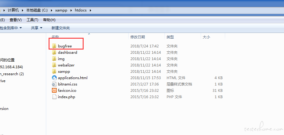 2.1、 解压后拷贝bugfree至D:\Development\xampp\htdocs\ 并命名为bugfree