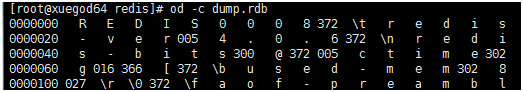 下面通过linux的od命令来查看redis服务器产生的RDB 文件,并指定-c参数可以以ASCII编码方式打印信息。信息中能直接看到的信息是:第一部分是redis, Db_version部分是0008, Eof部分是372 。