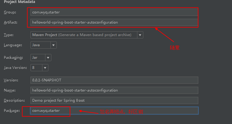 到此为止,一个简单的HelloWorid的starter就做出来了,我们只需要在我们的项目中导入那个starter(也就是前台唯一的作用)的依赖,就可以了,看看我的starter的坐标(还要记住,properties文件配置的@ConfigurationProperties(prefix = "wyq.hello"),这个prefix是可以在我们项目里面配置文件配置属性的哦~~)