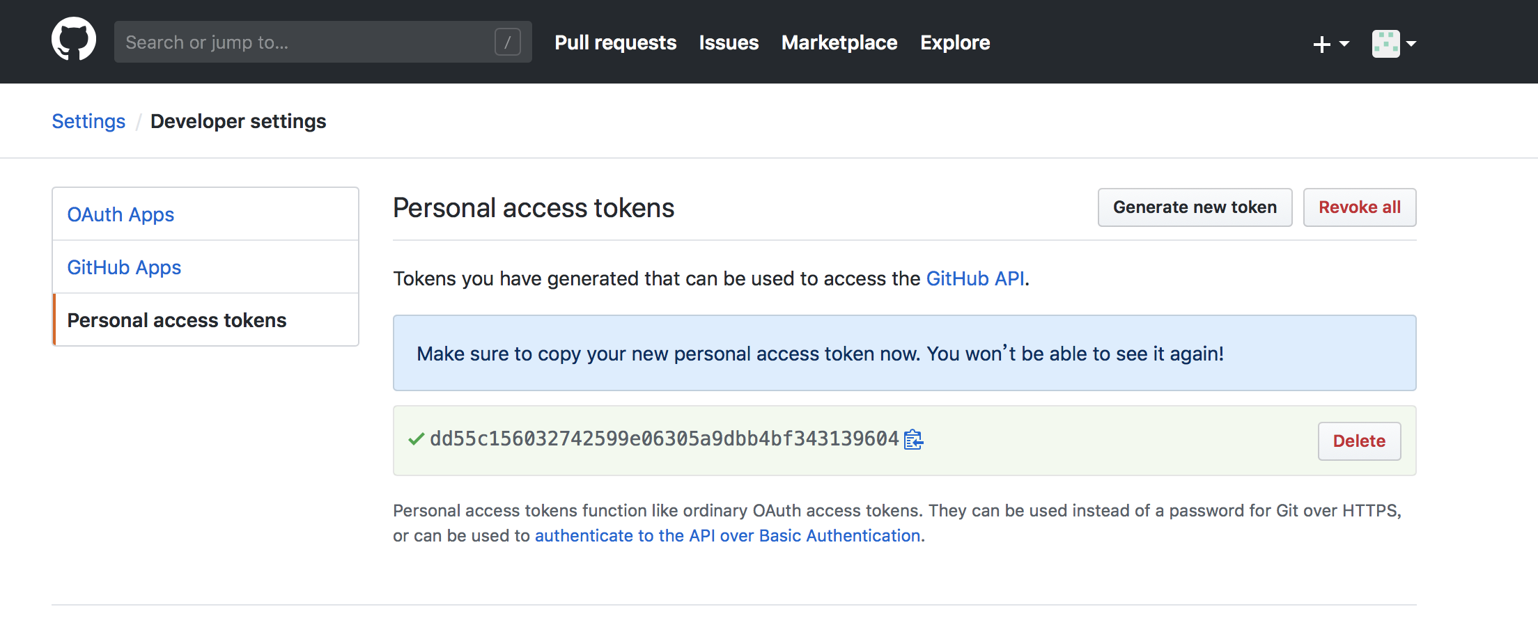 如上图所示,点击左上角,进入setting->Developer settings->personal access tokens,把这个值拷贝下来,基本上这里git就配置完成了