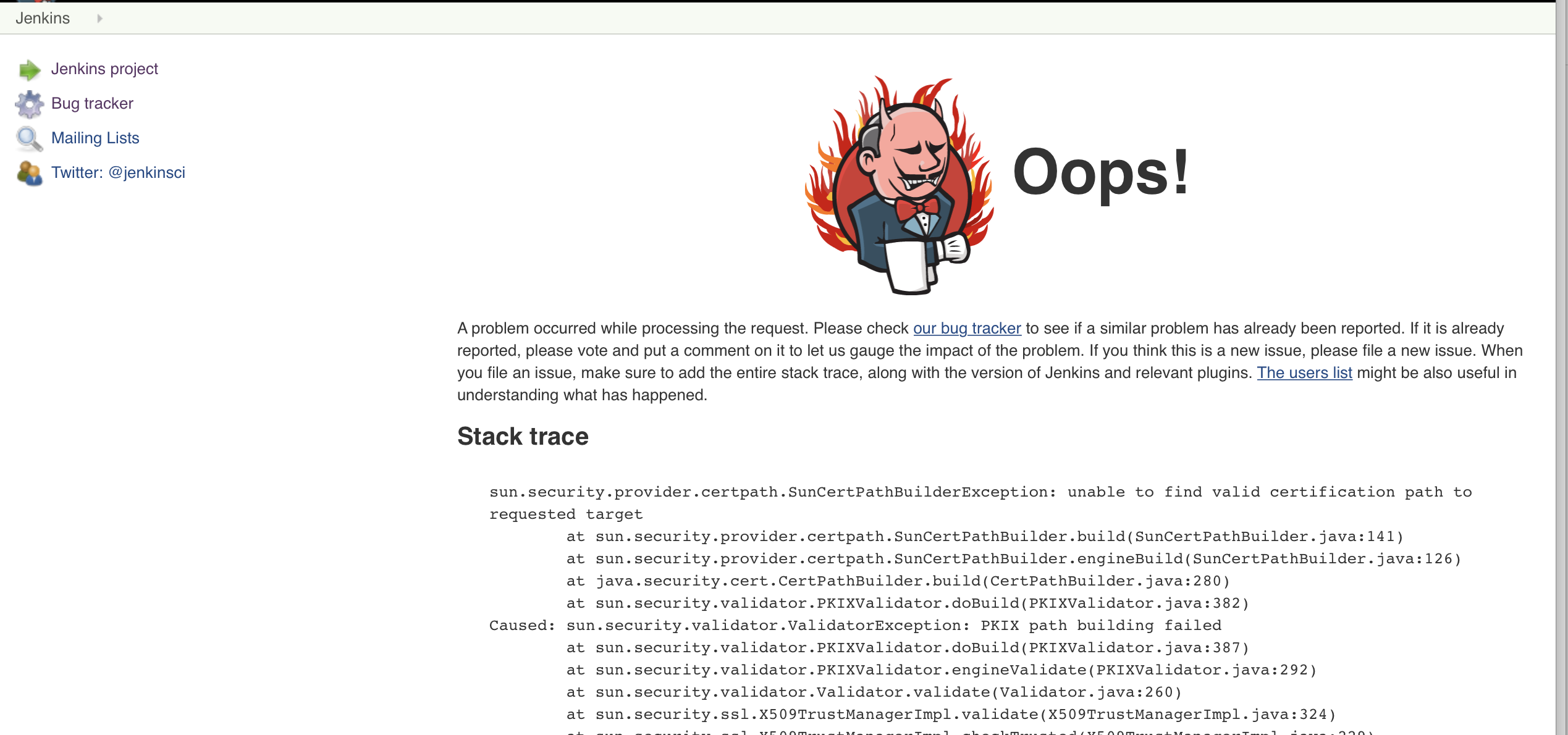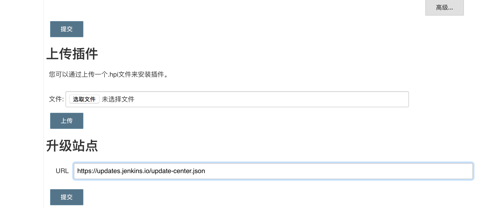 上图中笔者非常不幸,遇到了一个问题,原因是一个jenkins配置https错误导致的,打开一个新的tab,输入网址http://localhost:8080/pluginManager/advanced。 这里面最底下有个【升级站点】,把其中的链接改成http的就好了,http://updates.jenkins.io/update-center.json,如下图所示: