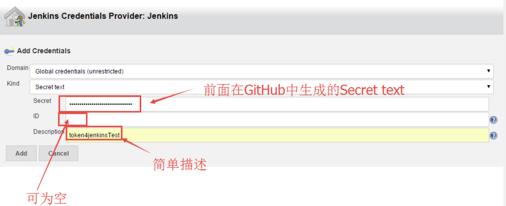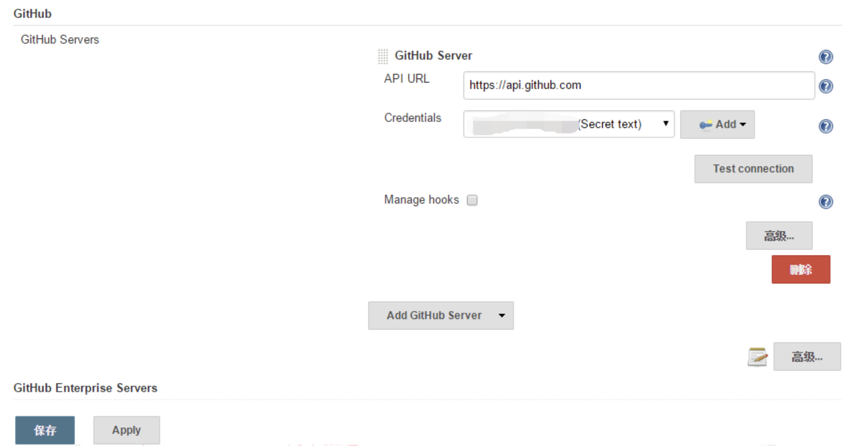 系统管理 --> 系统设置 --> GitHub --> Add GitHub Sever,API URL 输入 https://api.github.com,Credentials点击Add添加,Kind选择Secret Text并输入上文中的key即可,具体如下图所示。