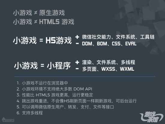 小游戏是小程序的一个类目,小游戏是微信开放给小程序的更多的能力,让小程序开发者有了开发游戏的能力。小游戏没有WXSS、WXML、多页面等内容,但加了一些渲染、文件系统以及后台多线程的功能。