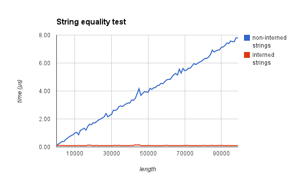 Intern 机制不会减少新对象的创建与销毁,但最终会节省出内存。这种机制还有另一个好处,即被 Interned 的相同字符串作比较时,几乎不花时间。实验数据如下(资料来源:http://t.cn/ELu9n7R):
