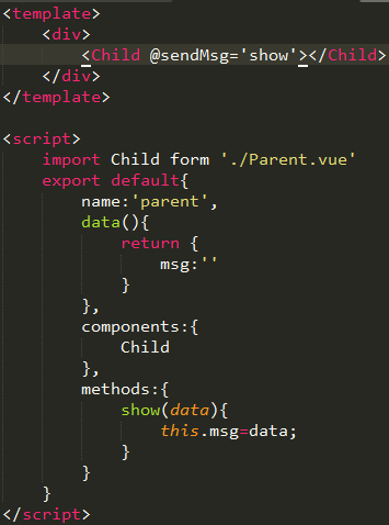 父组件中在子组件的标签内调用这个自定义的事件,@sendMsg='show',在show(data)这个方法中将子组件传来的值接受使用