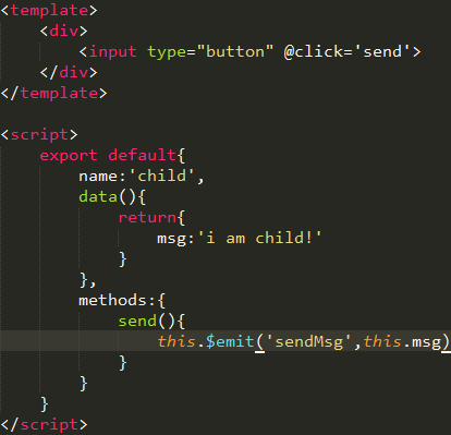 子组件中点击触发函数send,send方法中使用$emit('sendMsg', this.data)第一个参数是自定义一个事件名字,第二个参数是要发送的内容