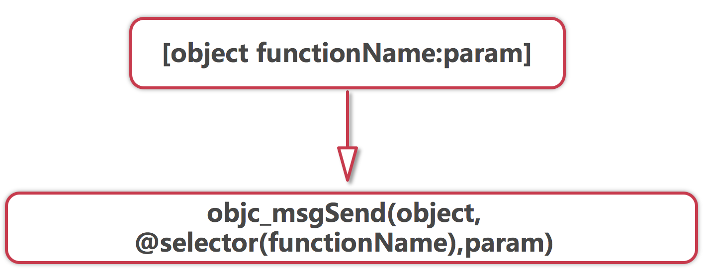 这是一个概括性的说话,具体是这样滴,我们的Clang编译器在编译时会把OC方法调用转换成C函数的调用,这里C函数主要是指objc_msgSend,当然还有objc_msgSendSuper、objc_msgSend_stret、objc_msgSendSuper_stret等方法,都是用于发送消息的,在message.h文件中。有两个参数需要注意,id self和SEL op,第一个是消息接受者,第二个是要执行的方法@selector,所有的OC方法调用在中转换成objc_msgSend时,都会添加好这两个参数。