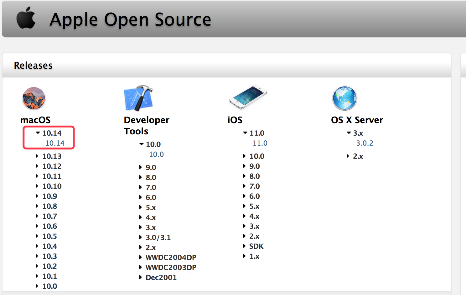 想要研究Runtime底层代码,首先必须要拿到苹果的Runtime源码, 苹果开源网站上可以下载到很多开源项目,当前最新macOS系统为10.14,为什么不选择iOS呢?因为苹果只开源mac OS下的Runtime啊。
