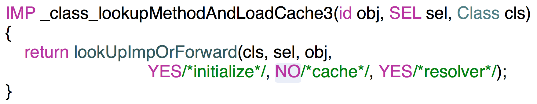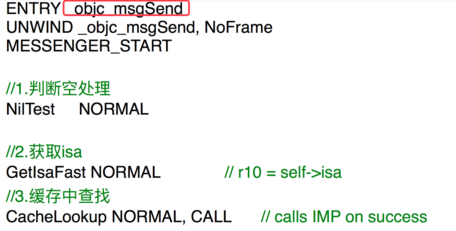 主要处理就是获取isa,然后从缓存Cache中查询IMP,找到了IMP直接调用它,没有找到则到当前isa的方法列表中去查询IMP,这里最终会调用的一个C函数_class_lookupMethodAndLoadCache3,这个C函数是提供给汇编代码的一个回调: