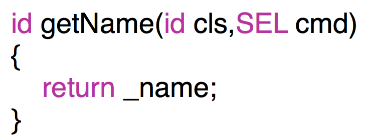 可以把getName当作IMP,那么OC调用方法的实际过程可以理解为,从对应类的方法列表中查找对应的IMP,然后调用IMP,此时可以传些参数,和平常调用C函数一模一样。举个栗子:[person eatingWithFood:@"apple" inPlace:@"kitchen"];