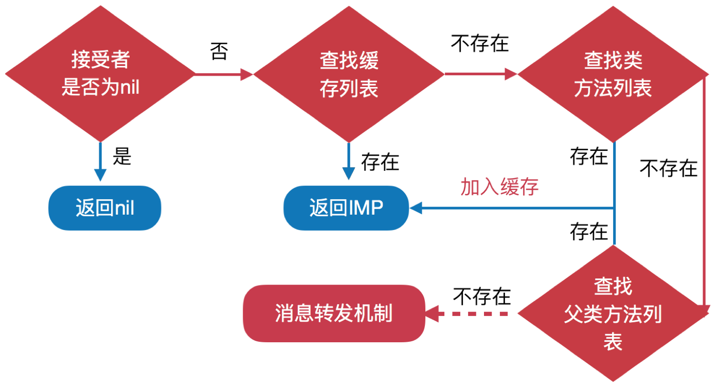 回归正传,在lookUpImpOrForward函数中到底干了些啥?平常所说的消息查找流程和消息转发都在这里面,先看消息超找流程,这里有个简单示意图: