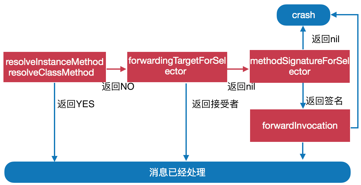 整个过程的目的就是需要查找到对应的IMP,先从缓存中查,没有,再到当前类查,再没有,到父类中查,直到把所有父类都查完,还是没有,那么代表这个方法在当前类和其父类中都没有实现,此时先尝试动态解析,解析失败就进入到了消息转发流程这块了,也给个示意图: