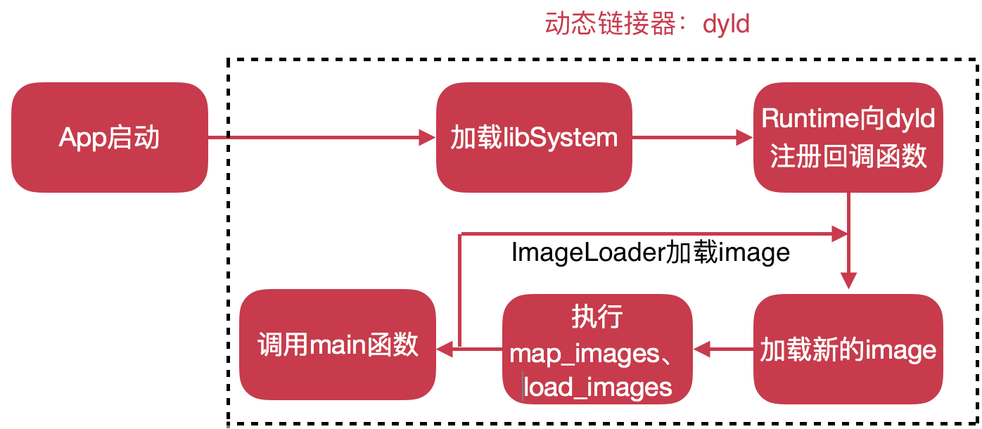 我们知道执行项目代码的入口函数是main函数,那么这个main函数执行之前是否还有其它操作呢。实际上当APP启动之后系统处理好一些服务之后会把处理权交个动态链接器dyld,从名字上就可以知道它和动态库有关系,dyld此时会把App类用到的所有动态库给加载起来,其中有个核心动态库libSystem,每个App都需要它,我们的Runtime就在里面,那么当加载到此动态库时,Runtime就会向dyld注册几个回调函数: