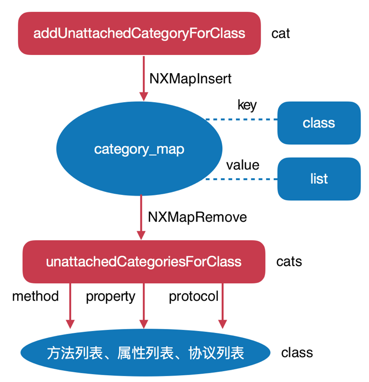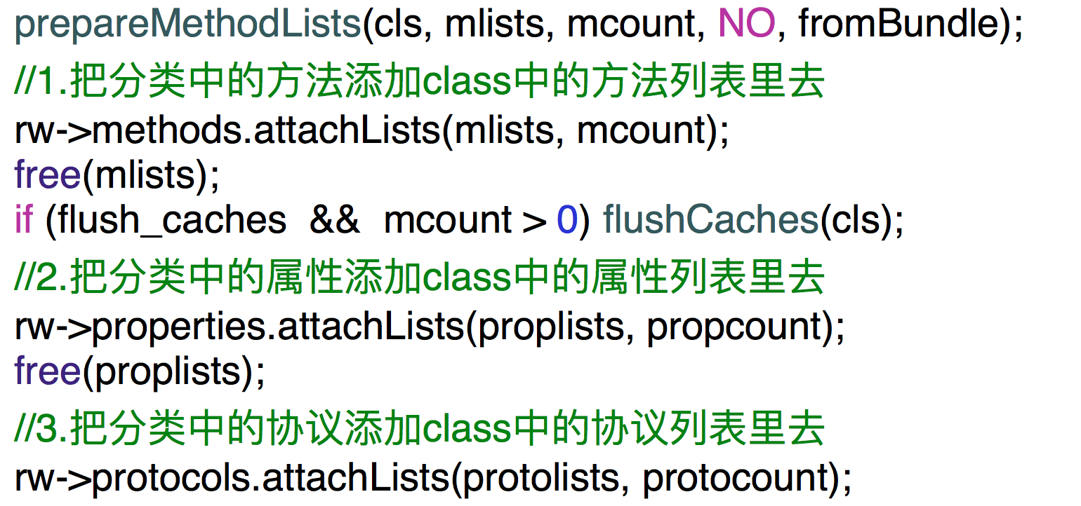 可以发现当给一个类添加方法、属性、协议时,会首先从全局哈希表中拿到其对应的分类列表list,然后遍历list,依次把每个分类中的方法、属性、协议都添加到主类中去。