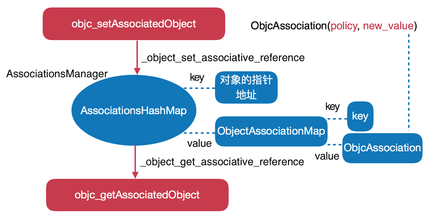 想要分析这块原理,得需要看两个函数objc_setAssociatedObject和objc_getAssociatedObject的实现,这两个方法又各自调用了函数_object_set_associative_reference和函数_object_get_associative_reference,具体操作都在里面。
