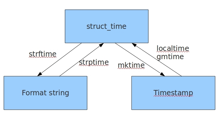 # 结构化时间——>字符串时间# time.strftime("格式定义","结构化时间")  结构化时间参数若不传,则显示当前时间print(time.strftime("%Y-%m-%d %X"))#结果>>> 2018-12-02 18:07:47print(time.strftime("%Y-%m-%d", time.localtime(1510000000)))#结果>>> 2017-11-07# 字符串时间——>结构化时间# time.strptime(时间字符串,字符串对应格式)print(time.strptime("2018-02-22", "%Y-%m-%d"))#结果>>> time.struct_time(tm_year=2018, tm_mon=2, tm_mday=22, tm_hour=0, tm_min=0, tm_sec=0, tm_wday=3, tm_yday=53, tm_isdst=-1)print(time.strptime("2018/03/01", "%Y/%m/%d"))#结果>>> time.struct_time(tm_year=2018, tm_mon=3, tm_mday=1, tm_hour=0, tm_min=0, tm_sec=0, tm_wday=3, tm_yday=60, tm_isdst=-1)# 结构化时间 ——> %a %b %d %H:%M:%S %Y串# time.asctime(结构化时间) 如果不传参数,直接返回当前时间的格式化串print(time.asctime(time.localtime(1510000000)))#结果>>> Tue Nov 7 04:26:40 2017print(time.asctime())#结果>>> Sun Dec 2 18:12:19 2018# 时间戳 ——> %a %b %d %H:%M:%S %Y串# time.ctime(时间戳) 如果不传参数,直接返回当前时间的格式化串print(time.ctime())#结果>>> Sun Dec 2 18:13:14 2018print(time.ctime(1510000000))#结果>>> Tue Nov 7 04:26:40 2017