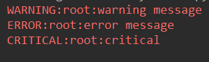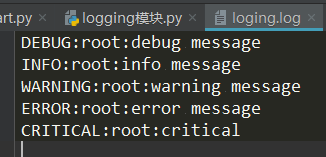 logging.critical('critical')默认情况下Python的logging模块将日志打印到了标准输出中,且只显示了大于等于WARNING级别的日志,这说明默认的日志级别设置为WARNING(日志级别等级CRITICAL > ERROR > WARNING > INFO > DEBUG),默认的日志格式为日志级别:Logger名称:用户输出消息。此时如果想改变显示,就需要在logging.basicConfig()中,把level级别调低