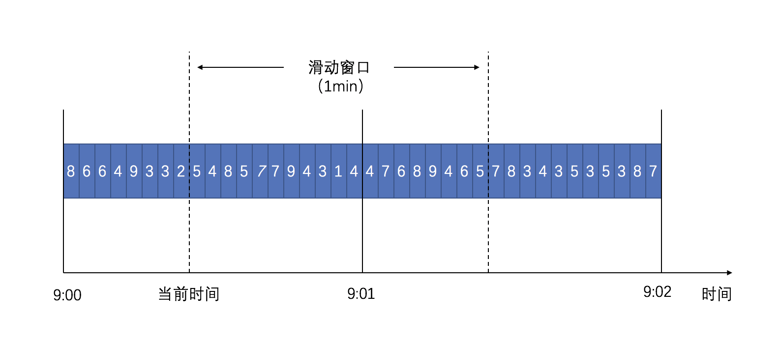 滑动窗口其实就是对固定窗口做了进一步的细分,将原先的粒度切的更细,比如1分钟的固定窗口切分为60个1秒的滑动窗口。然后统计的时间范围随着时间的推移同步后移。