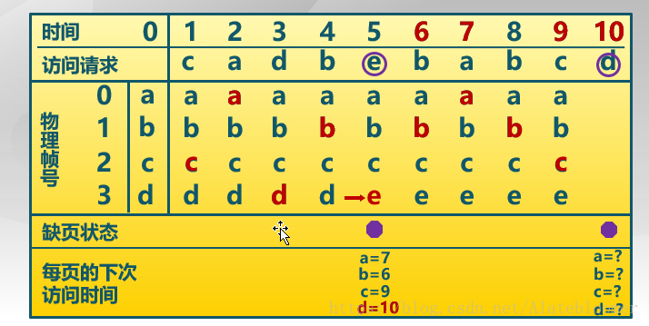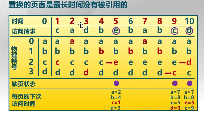 基本思路:当一个缺页中断发生时,对于保存在内存当中的每一个逻辑页面,计算在它的也一次访问之间,还需等待多长的时间,从中选择等待时间最长的那个,作为被置换的页面。