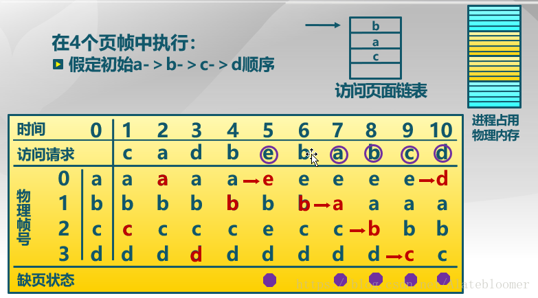 基本思路:选择在内存中驻留时间最长的页面并淘汰之。具体来说:OS维护着一个链表,记录了所有内存当中的逻辑页面。从链表的排序顺序来看,链首页面的驻留时间最长,链尾页面的驻留时间最短。当发生一个页面中断时,把链首页面淘汰出局,把新的页面添加到链表的末尾。