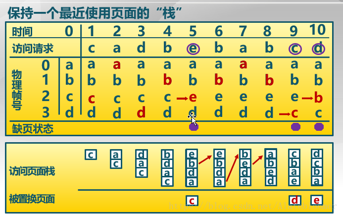 设置一个活动页面堆栈:当访问某页时,将此页号入栈顶,并去除栈内的重复页。当需要淘汰一个页面时,总是选择栈底的页面,它就是最久未使用的。