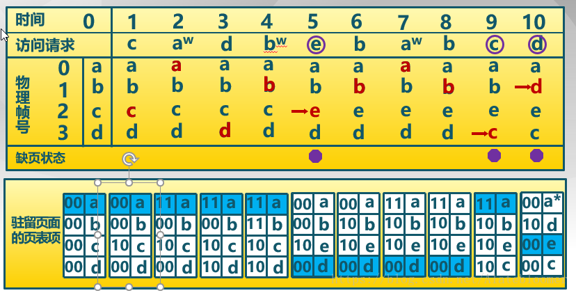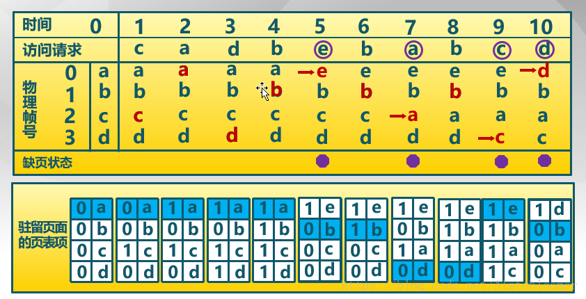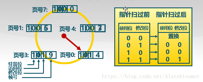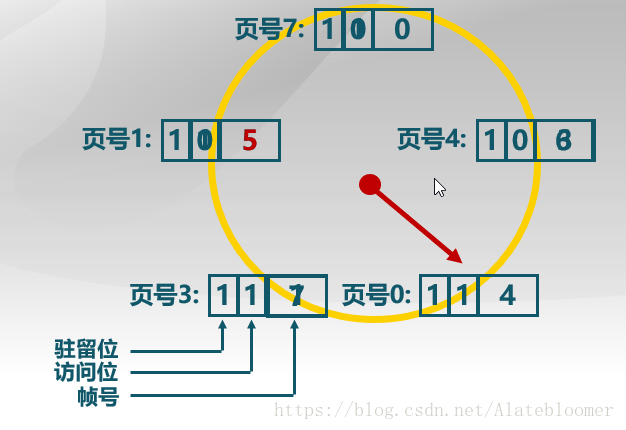 页号0和1的访问位被置0,页号为1的页表项被替换,访问位置1,指针指向下一个位置页号7
