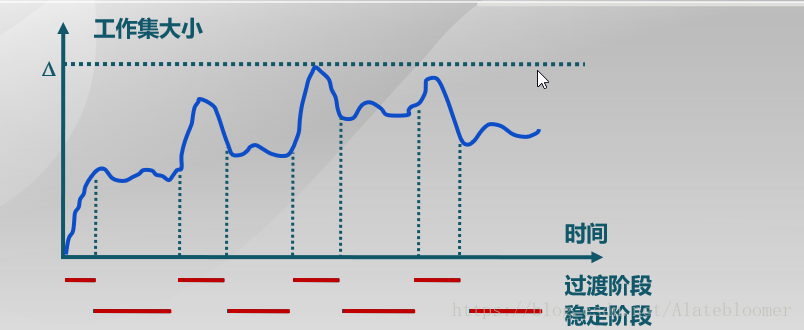 工作集的变化:进程开始后,随着访问新页面逐步建立较稳定的工作集,当内存访问的局部性区域的位置大致稳定时,工作集大小也大致稳定。局部性区域的位置改变时,工作集快速扩张和收缩过渡到下一个稳定值