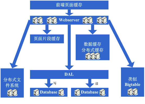 突然有一天,发现这个完美的时代也要结束了,数据库的噩梦又一次出现在眼前了,由于添加的webserver太多了,导致数据库连接的资源还是不够用,而这个时候又已经分库分表了,开始分析数据库的压力状况,可能会发现数据库的读写比很高,这个时候通常会想到数据读写分离的方案,当然,这个方案要实现并不容易,另外,可能会发现一些数据存储在数据库上有些浪费,或者说过于占用数据库资源,因此在这个阶段可能会形成的架构演变是实现数据读写分离,同时编写一些更为廉价的存储方案,例如BigTable这种。