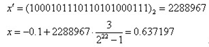 例如一个二进制串<1000101110110101000111>表示实数值0.637197。