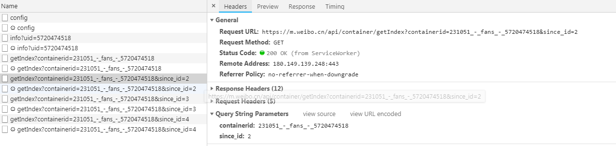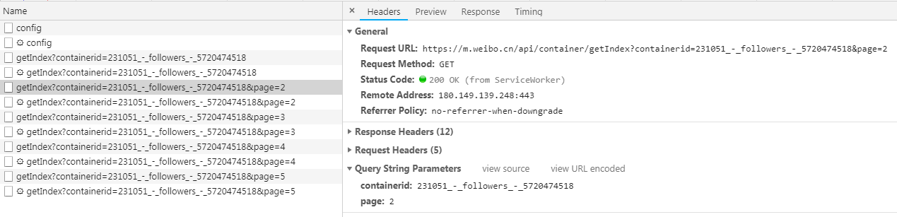 这些请求有两个参数,containerid和page,通过改变page的数值,我们就能得到更多的请求了。获取其粉丝的用户信息的步骤是一样的,除了请求的链接不同之外,参数也不同,修改一下就可以了。