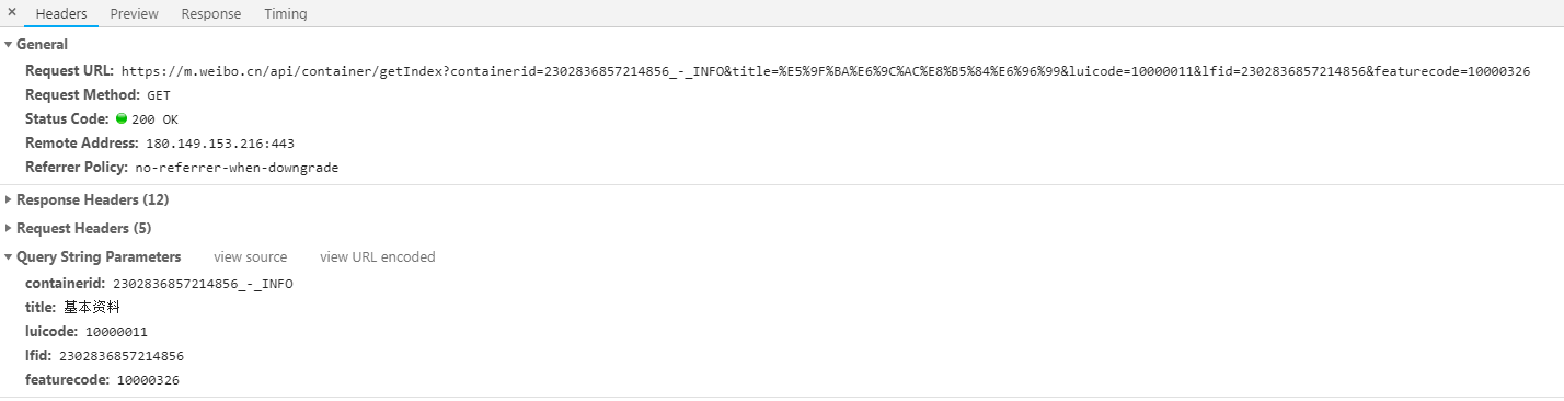 1 uid_str = "230283" + str(uid) 2 url = "https://m.weibo.cn/api/container/getIndex?containerid={}_-_INFO&title=%E5%9F%BA%E6%9C%AC%E8%B5%84%E6%96%99&luicode=10000011&lfid={}&featurecode=10000326".format(uid_str, uid_str) 3 data = { 4 "containerid": "{}_-_INFO".format(uid_str), 5 "title": "基本资料", 6 "luicode": 10000011, 7 "lfid": int(uid_str), 8 "featurecode": 10000326