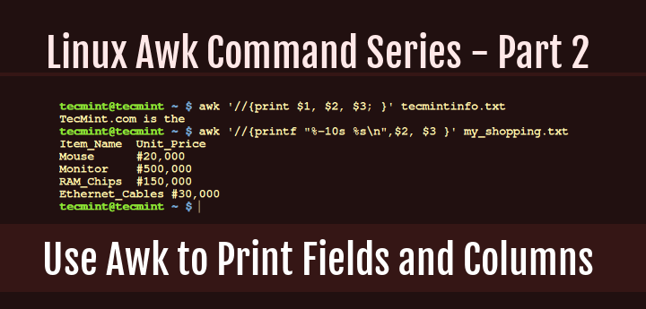 $ awk '//{print $2, $3 }' my_shopping.txt Item_Name Unit_Price