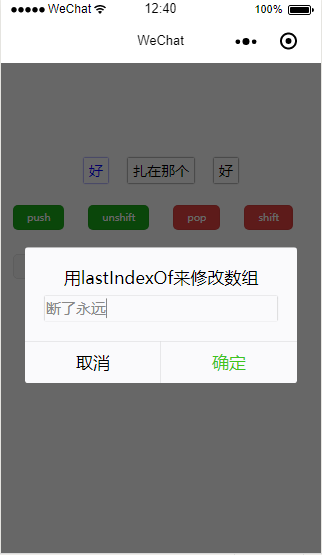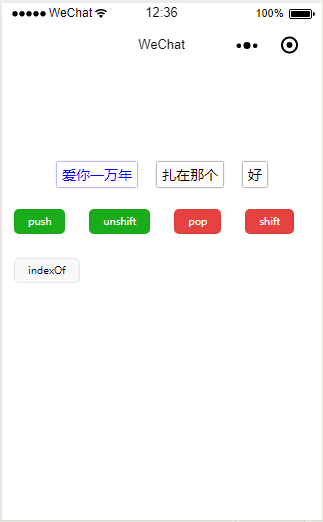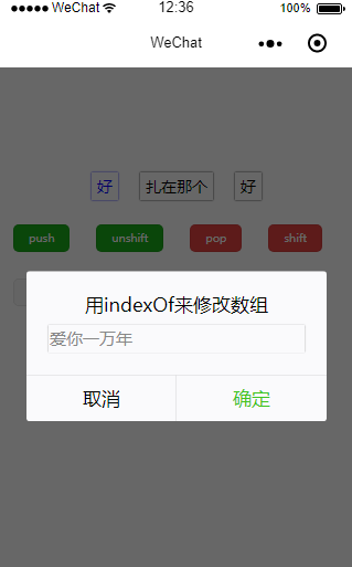 array[selectIndex]="爱你一万年";//array=>["爱你一万年","扎在那个","好"]小程序配图(我选取第一个“好”)