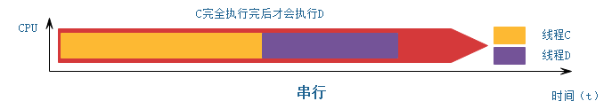 如下图所示,线程A与线程B同在一个CPU内执行,且任一t时刻内,都只有一个线程(A或者B)被执行,所以线程A与线程B是并发执行的。线程C和线程D分别在两个CPU内执行,且在某一个t时刻内同时都在执行,所以线程C和线程D是并行的。