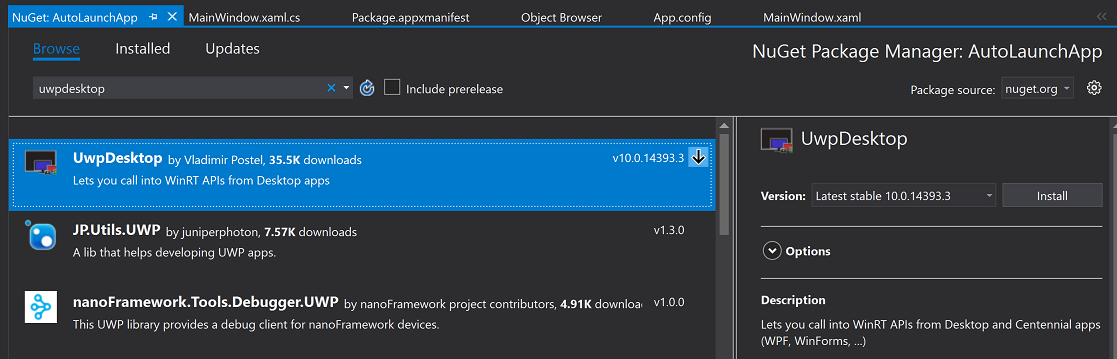 第一种是通过Nuget来安装一个叫做UwpDesktop的库,优点是比较简单,维护起来也方便。