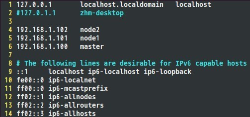 通过上面命令可以将IP改为192.168.1.100。将每个结点的IP地址设置完成后,就可以配置hosts文件了,hosts文件路径为;/etc/hosts,我的hosts文件配置如下,大家可以参考自己的IP地址以及相应的主机名完成配置