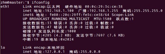 master结点能快速查到并访问各个结点。在上述3个虚机结点上均需要配置此文件。由于需要确定每个结点的IP地址,所以在配置hosts文件之前需要先查看当前虚机结点的IP地址是多少,可以通过ifconfig命令进行查看,如本实验中,master结点的IP地址为:
