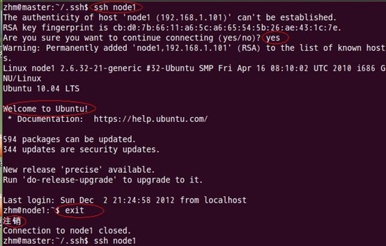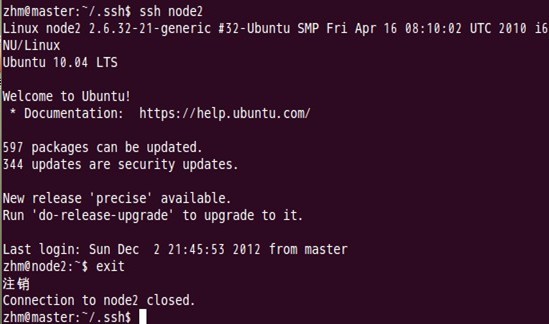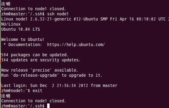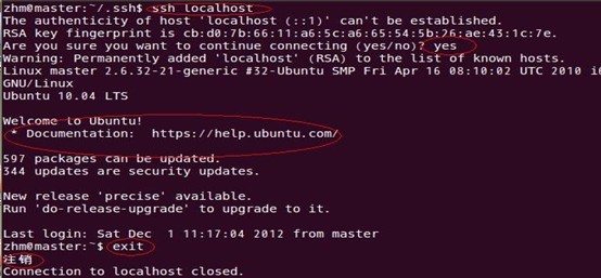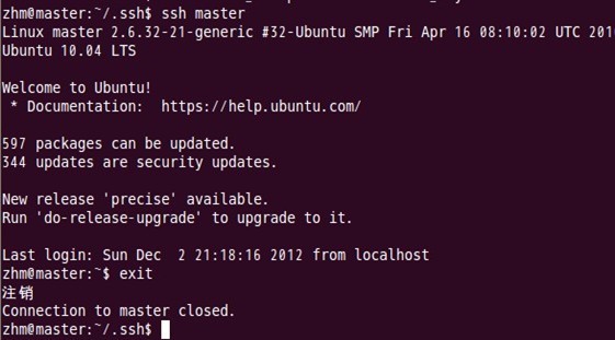 即在单机结点上用ssh进行登录,看能否登录成功。登录成功后注销退出,过程如下: