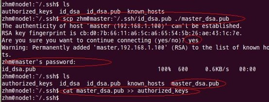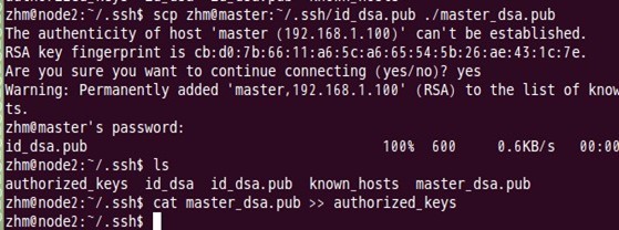 如上过程显示了node1结点通过scp命令远程登录master结点,并复制master的公钥文件到当前的目录下,这一过程需要密码验证。接着,将master结点的公钥文件追加至authorized_keys文件中,通过这步操作,如果不出问题,master结点就可以通过ssh远程免密码连接node1结点了。在master结点中操作如下: