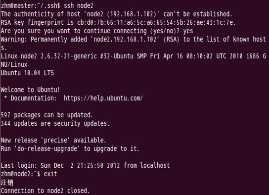 Master通过ssh免密码登录至node2结点测试: