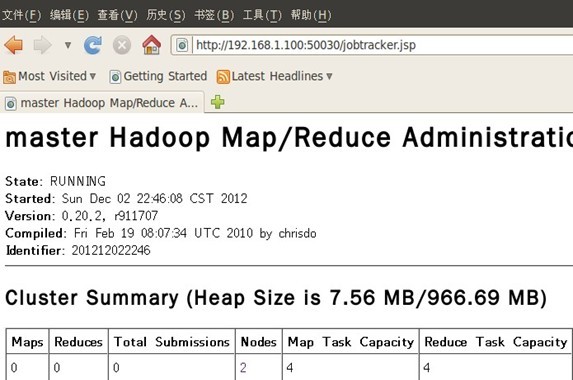 在浏览器中输入:http://192.168.1.100:50030,网址为master结点所对应的IP: