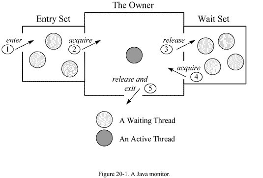 当某代码并不持有监视器的使用权时(如图中5的状态,即脱离同步块)去wait或notify,会抛出java.lang.IllegalMonitorStateException。也包括在synchronized块中去调用另一个对象的wait/notify,因为不同对象的监视器不同,同样会抛出此异常。