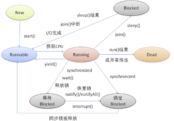 调用wait(),使该线程处于等待池(wait blocked pool),直到notify()/notifyAll(),线程被唤醒被放到锁定池(lock blocked pool ),释放同步锁使线程回到可运行状态(Runnable)