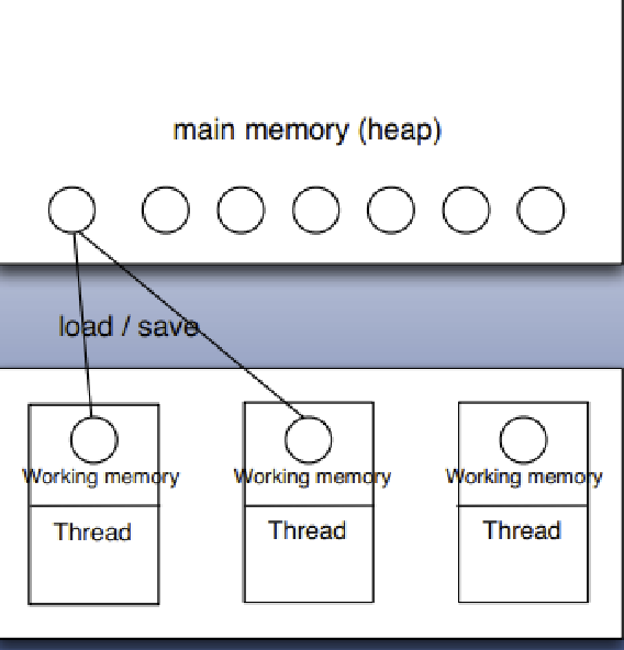 多线程的内存模型:main memory(主存)、working memory(线程栈),在处理数据时,线程会把值从主存load到本地栈,完成操作后再save回去(volatile关键词的作用:每次针对该变量的操作都激发一次load and save)。