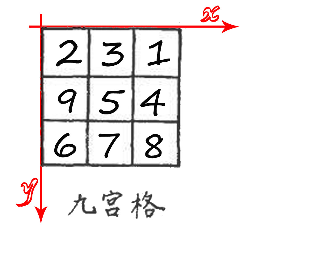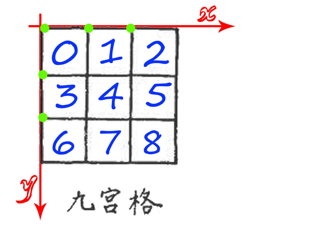 (1)以左上角为原点,建立坐标系,蓝色数字表示位置序号,