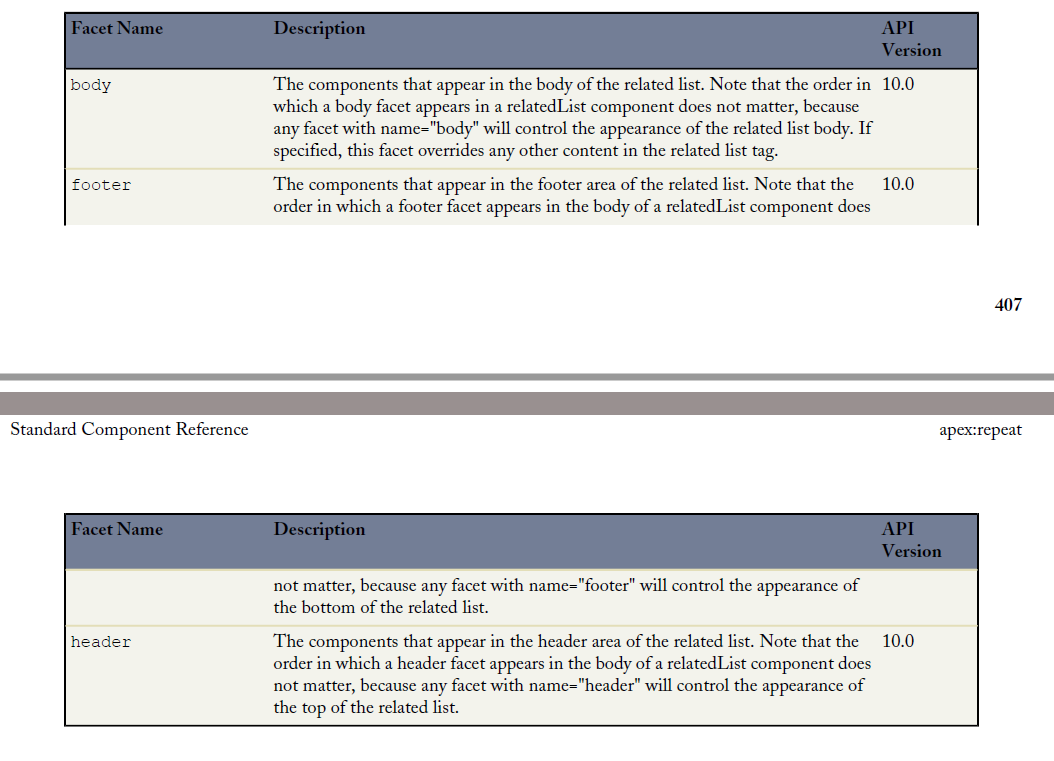 apex:dataTable /apex:actionStatus / apex:column / apex:relatedList等,不同的组件支持的不同的自定义元素位置不同,具体可以查看API。