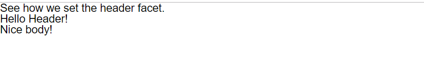 <aura:component> See how we set the header facet.<br/> <c:facetHeader> Nice body! <aura:set attribute="header"> Hello Header! </aura:set> </c:facetHeader> </aura:component>