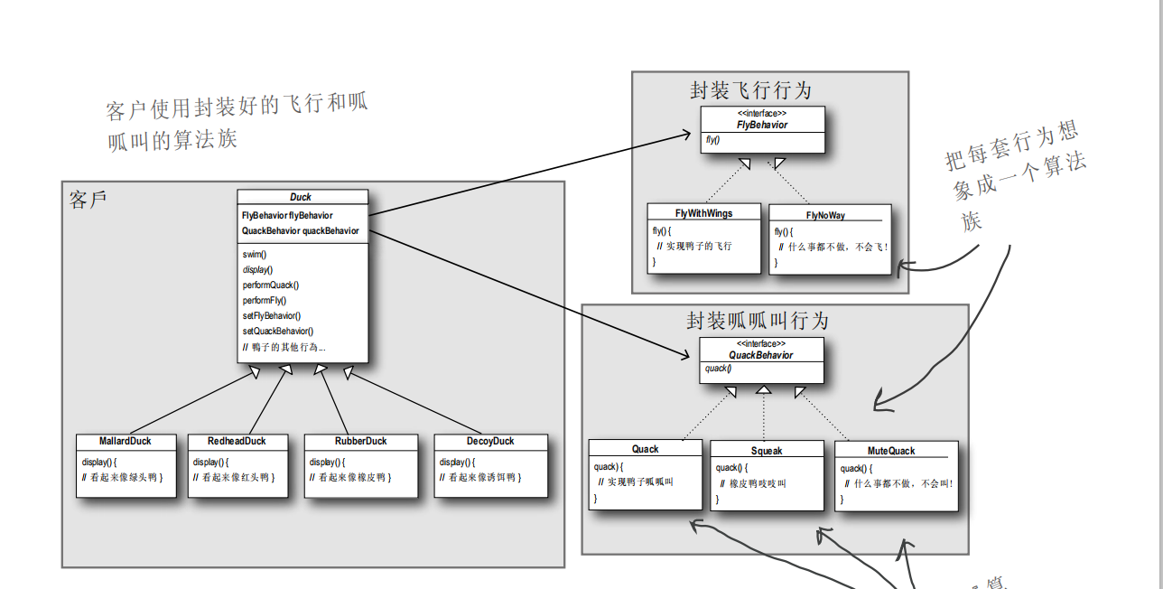 实例剖析:基类鸭子,鸭子有飞行及喊叫的行为,飞行和喊叫都可以分别封装成一个算法族,将算法接口放入鸭子基类中,那么在鸭子子类中可以自由选择行为。如果有新的飞行或者喊叫方式,则只需要增加一个飞行策略类继承飞行接口即可。