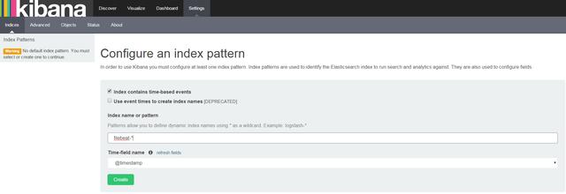 Kibana是一个与Elasticsearch配合使用的图形化工具,提供高度可定制化的UI。关于Kibana的更详细的安装过程可以参考这里。确认Kibana安装并运行成功后,在浏览器中访问http://localhost:5601,第一次使用会跳转至Kibana的配置界面,填入配置的索引的pattern(本教程的index pattern是filebeat-*),敲入回车,然后点击Create: